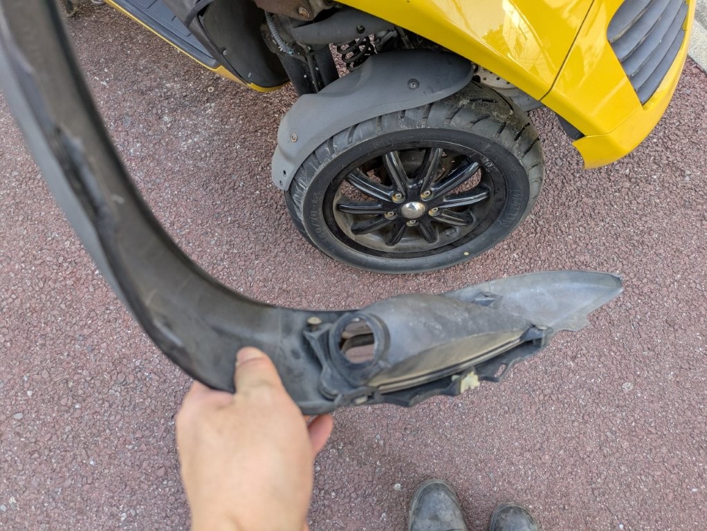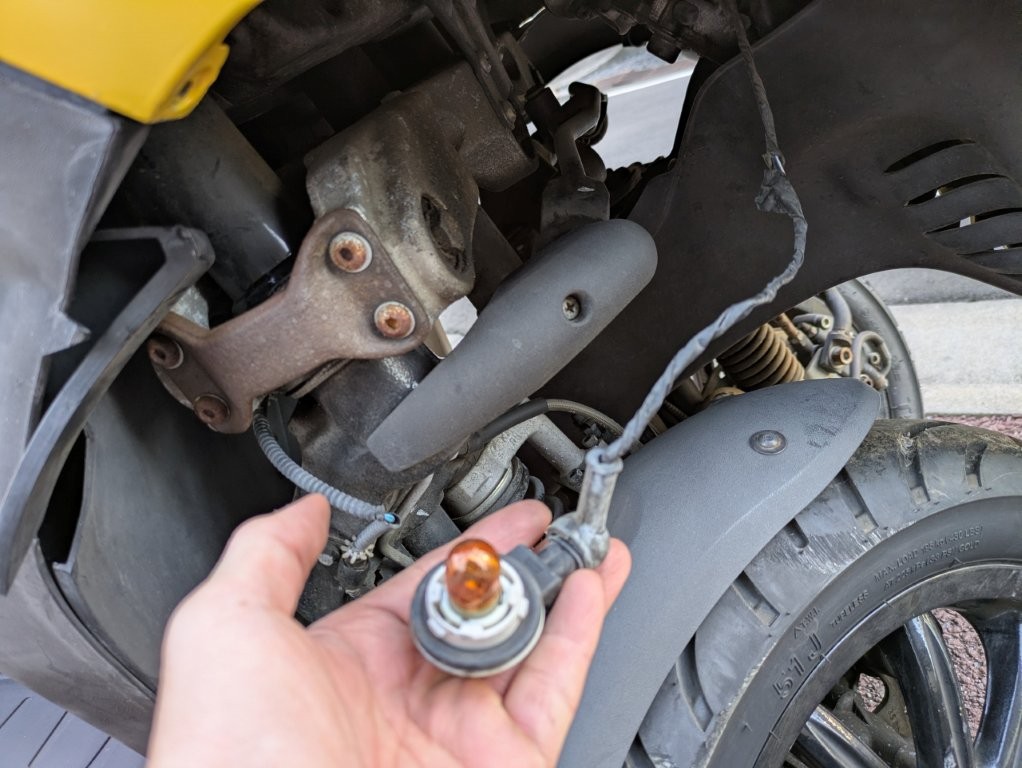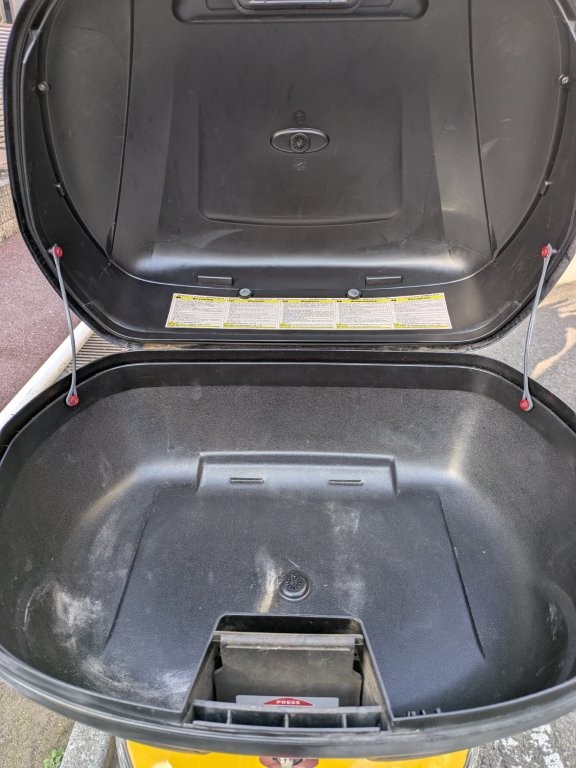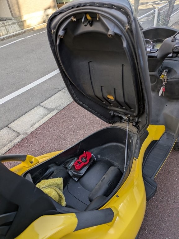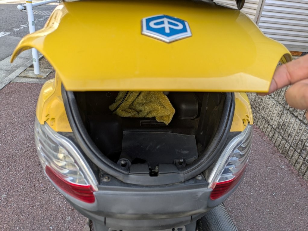 バッテリーが上がっているので後ろのボックスから手をつっこんでシートを開けて外付けバッテリーでエンジン始動しました。